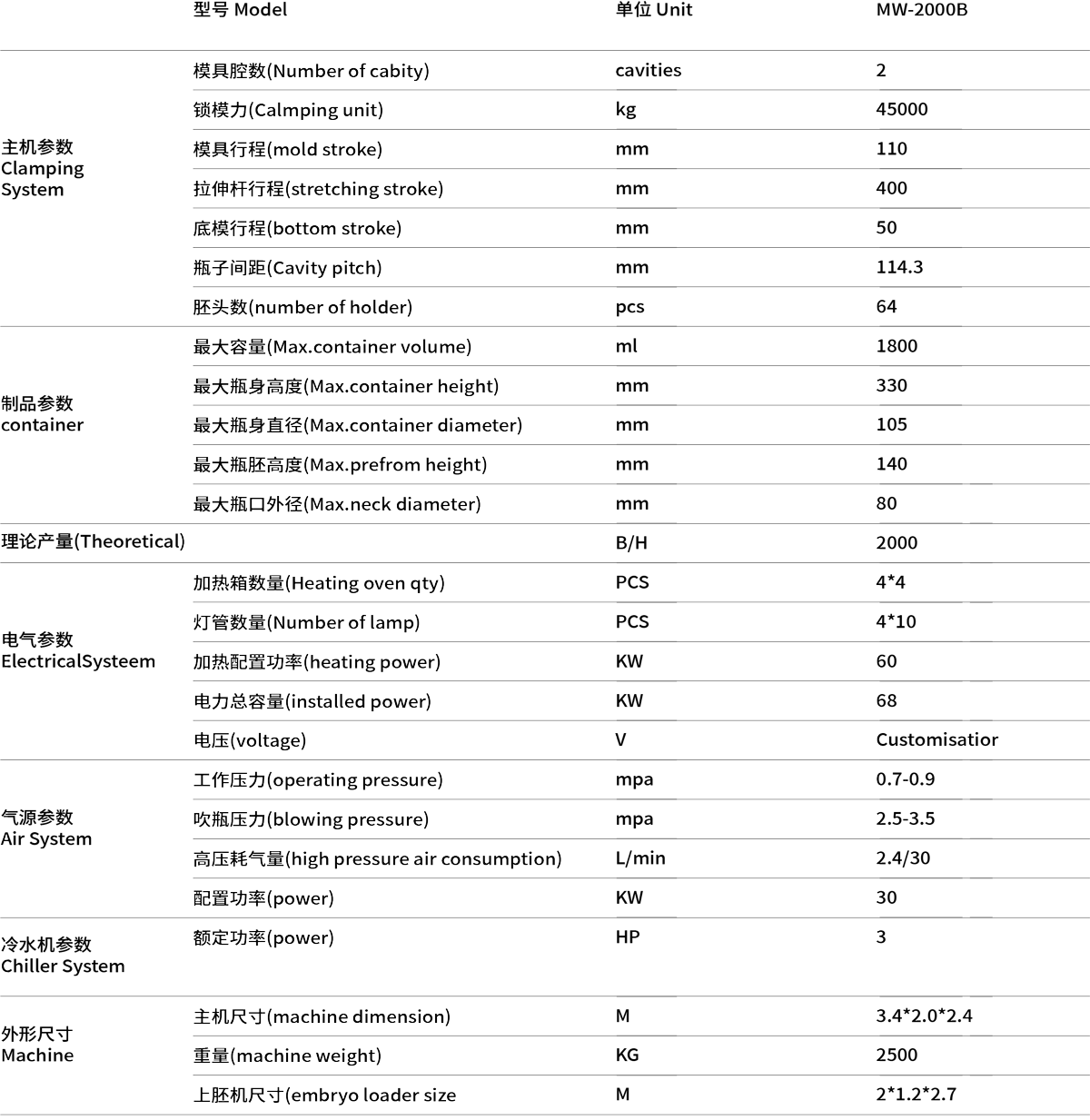 采用伺服電機(jī)驅(qū)動(dòng)環(huán)形鏈條; 采用伺服單通道上胚; 采用鋁合金制造的高壓吹氣組合閥,可有氣體回收裝置,減少能源消耗,保護(hù)環(huán)境; 采用PID恒定控制烤箱瓶胚加熱和風(fēng)機(jī)排風(fēng)。